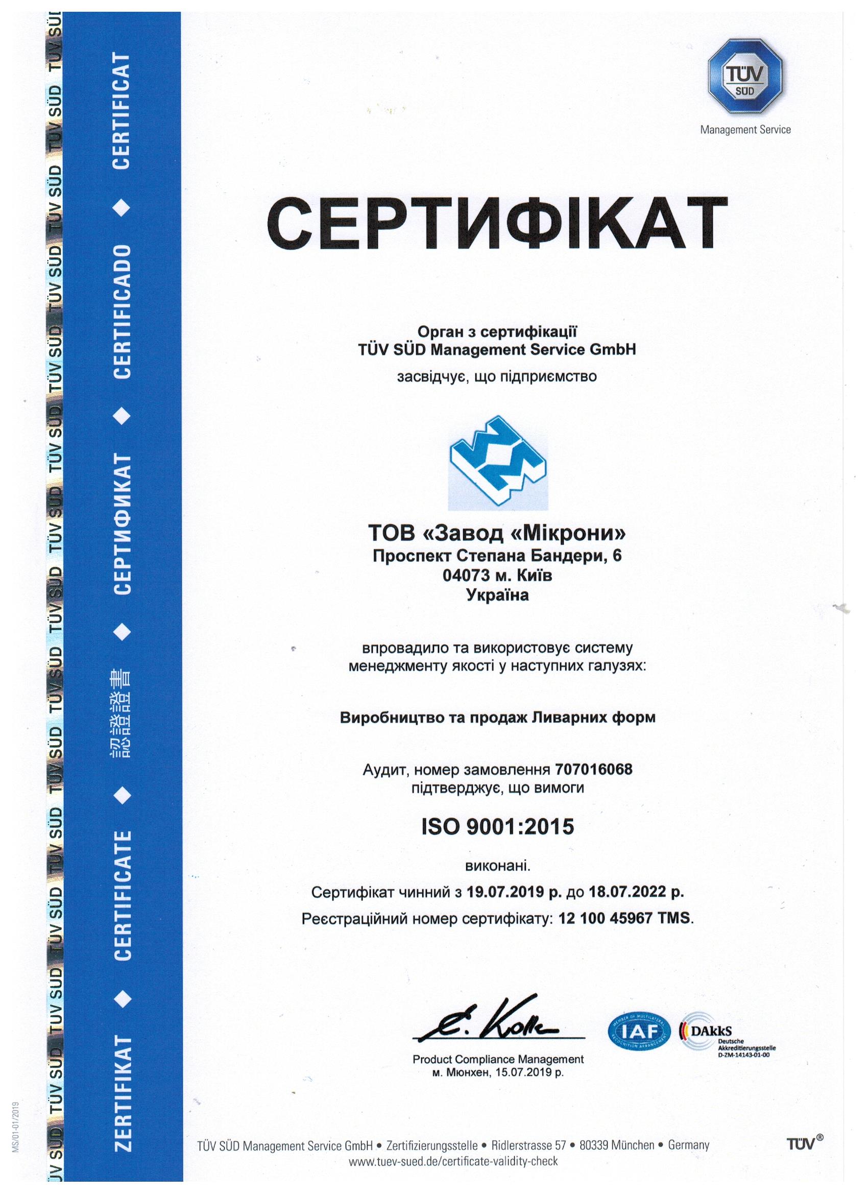Система управления качеством сертифицирована TUV SUD Management Service, Germany на соответствие стандарту ISO 9001-2015.